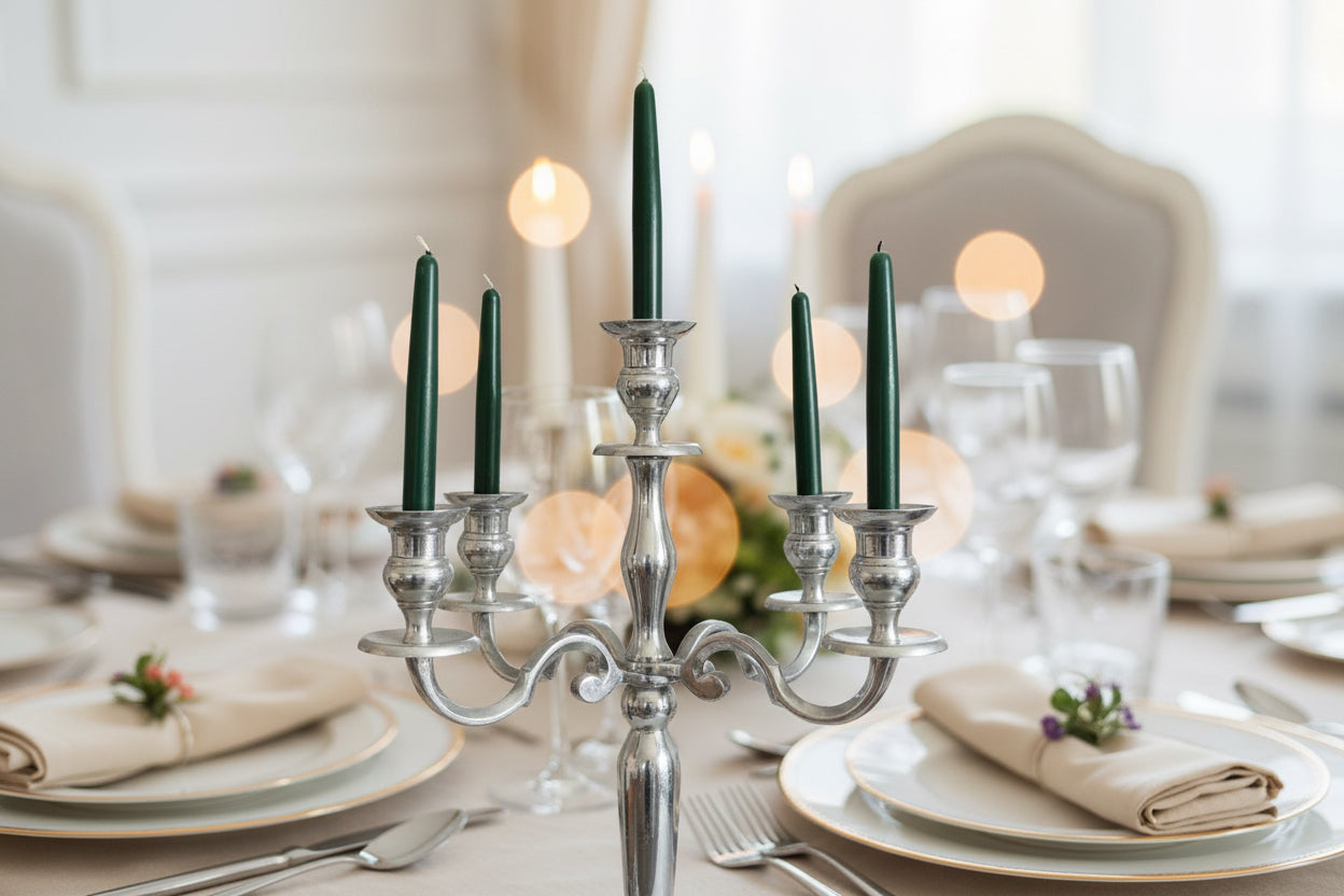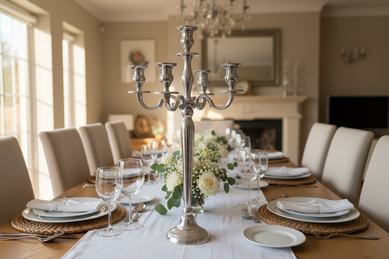 Elevate your table setting with this striking five-arm candelabra, a timeless centrepiece for intimate dinners and grand celebrations alike. Designed to accommodate tapered candles, it creates an elegant focal point that commands attention. Style it with a lush wreath encircling the base for an extra special professional touch or let its refined silhouette stand alone as a statement piece. Perfect for adding warmth and ambiance to any entertaining occasion.