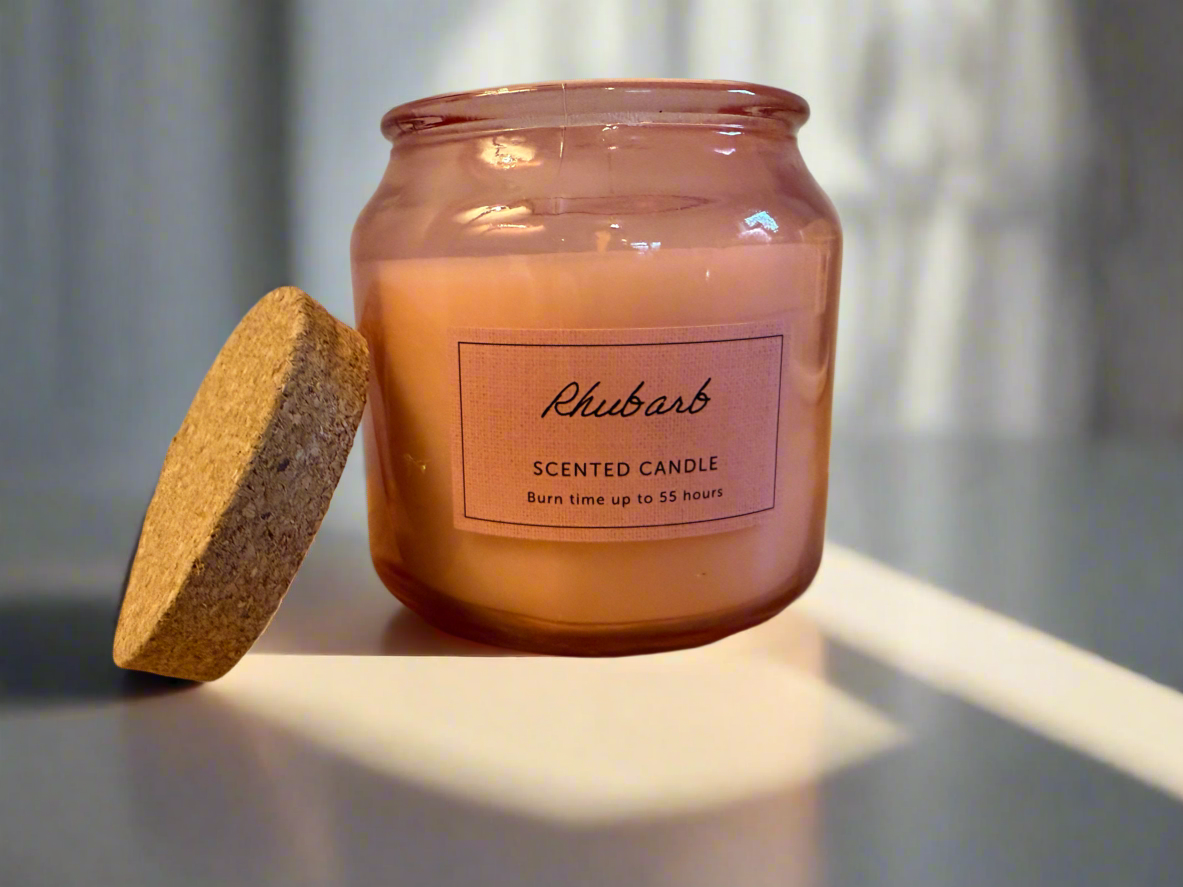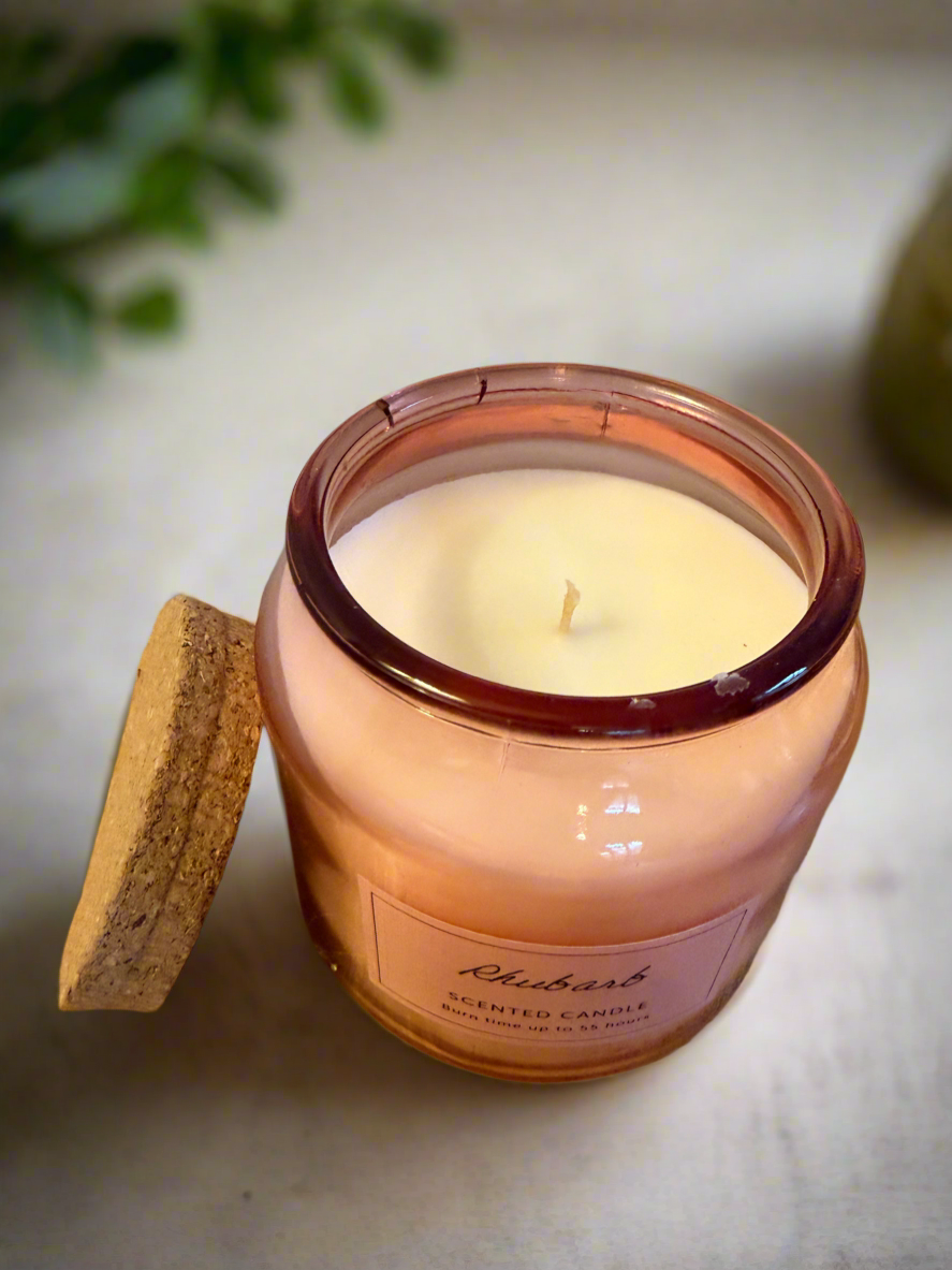 Enhance your home with the delightful fragrance of our long-lasting rhubarb scented candle. Encased in elegant colored glass with a cork lid, it makes a perfect gift. Pair it with one of our handmade table wreaths for a unique touch to any occasion.