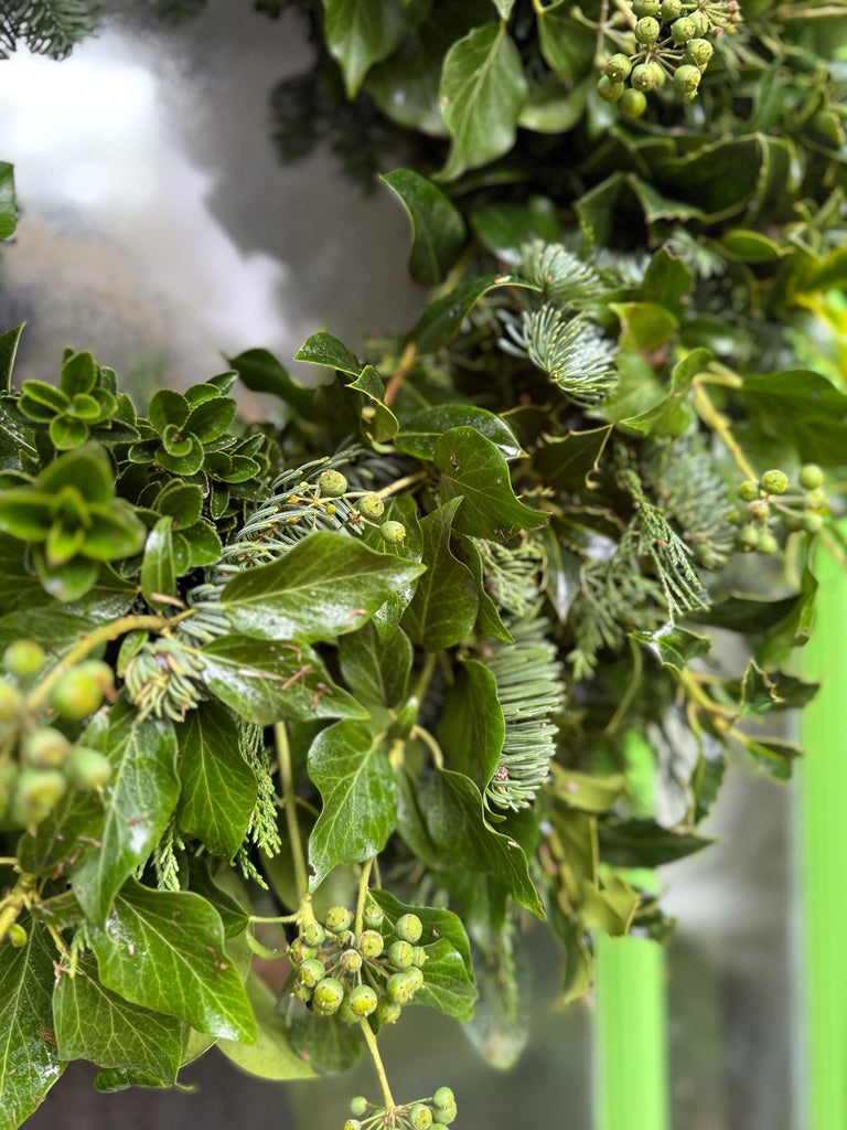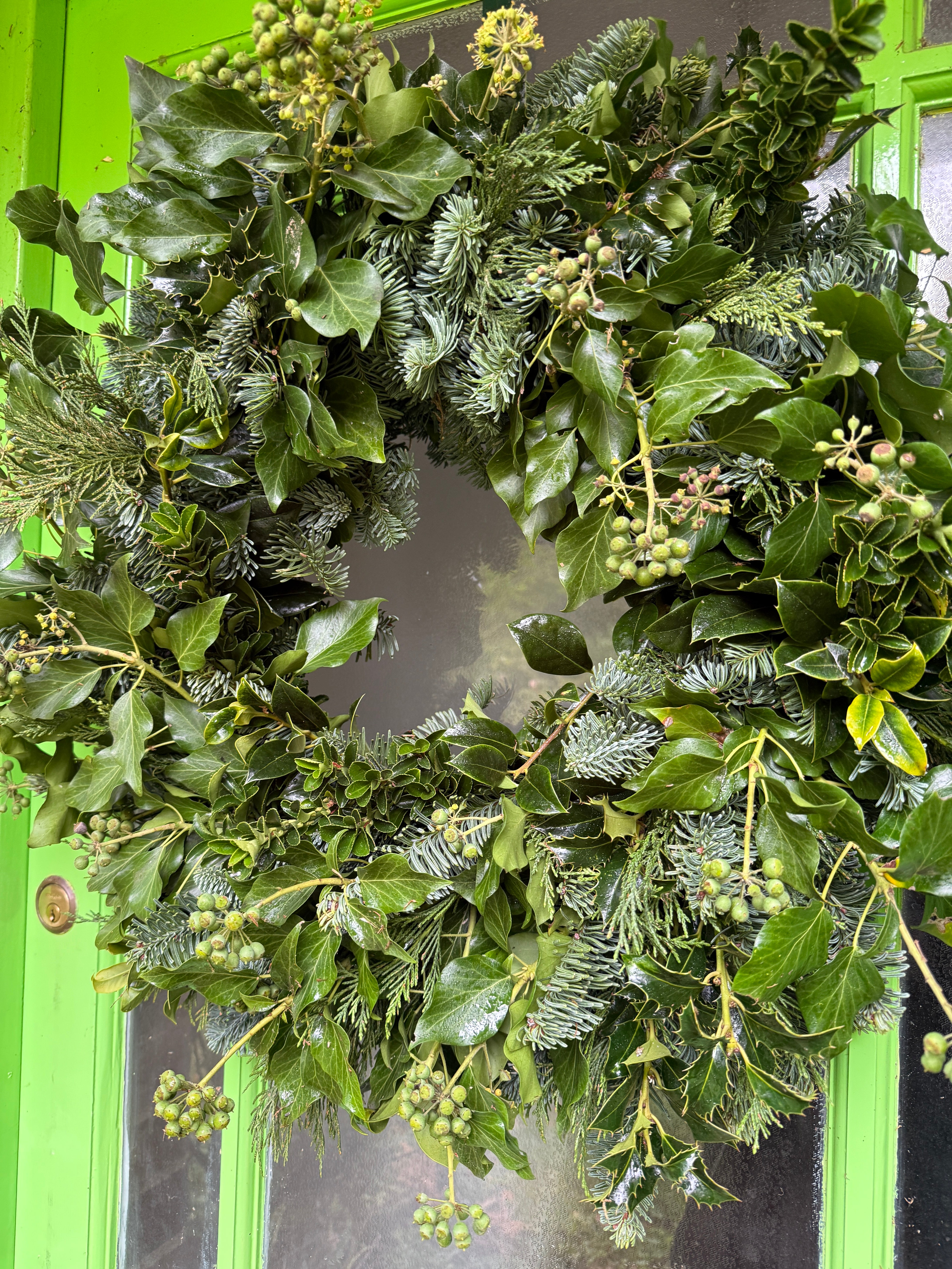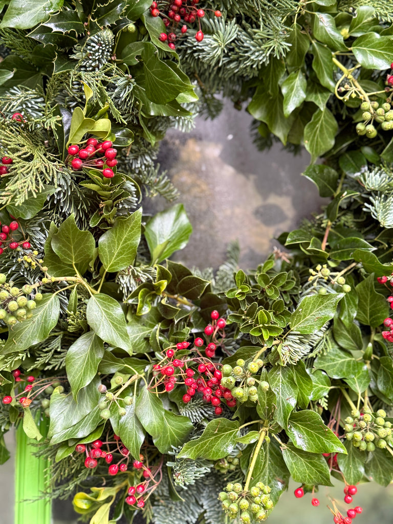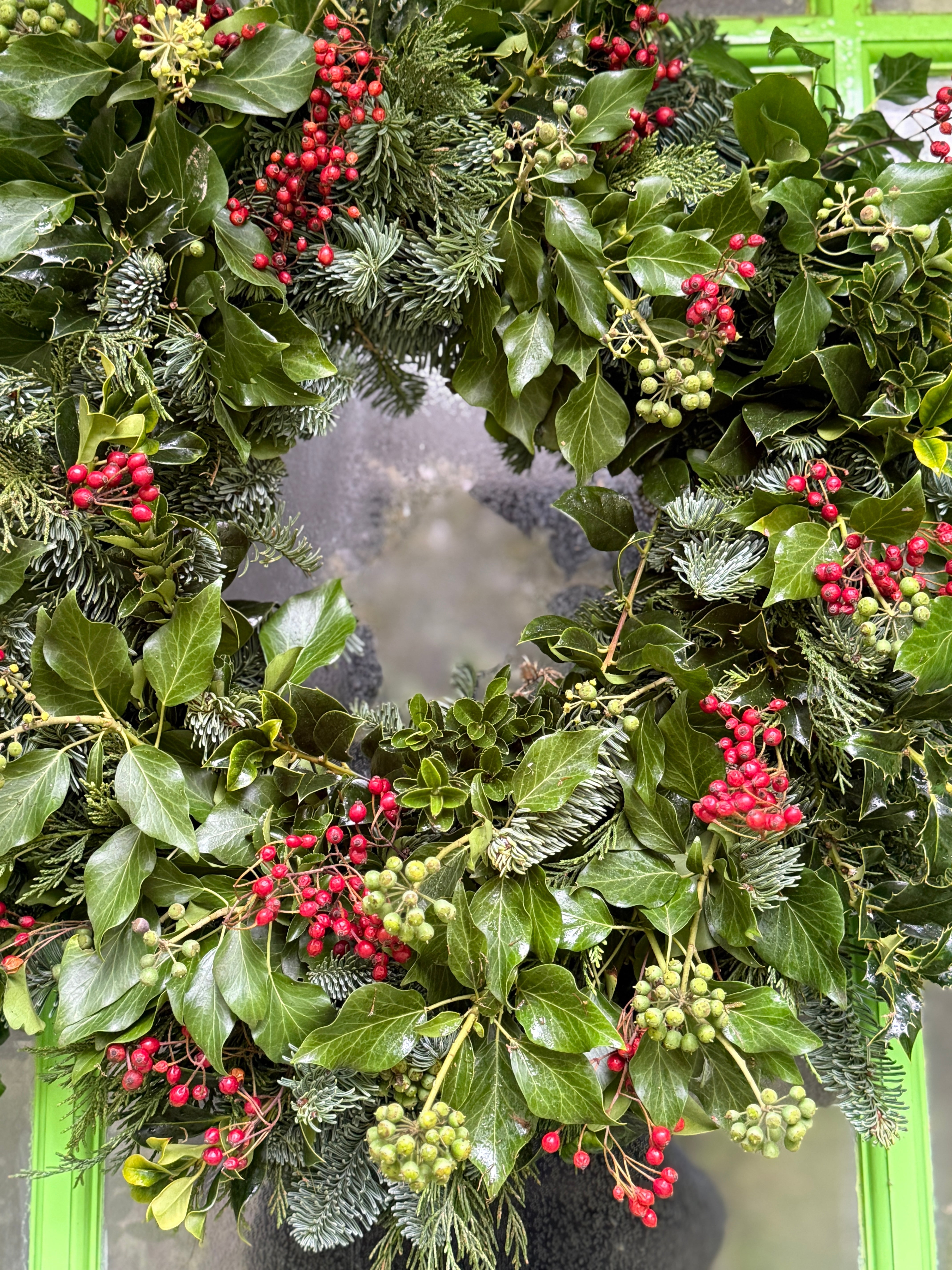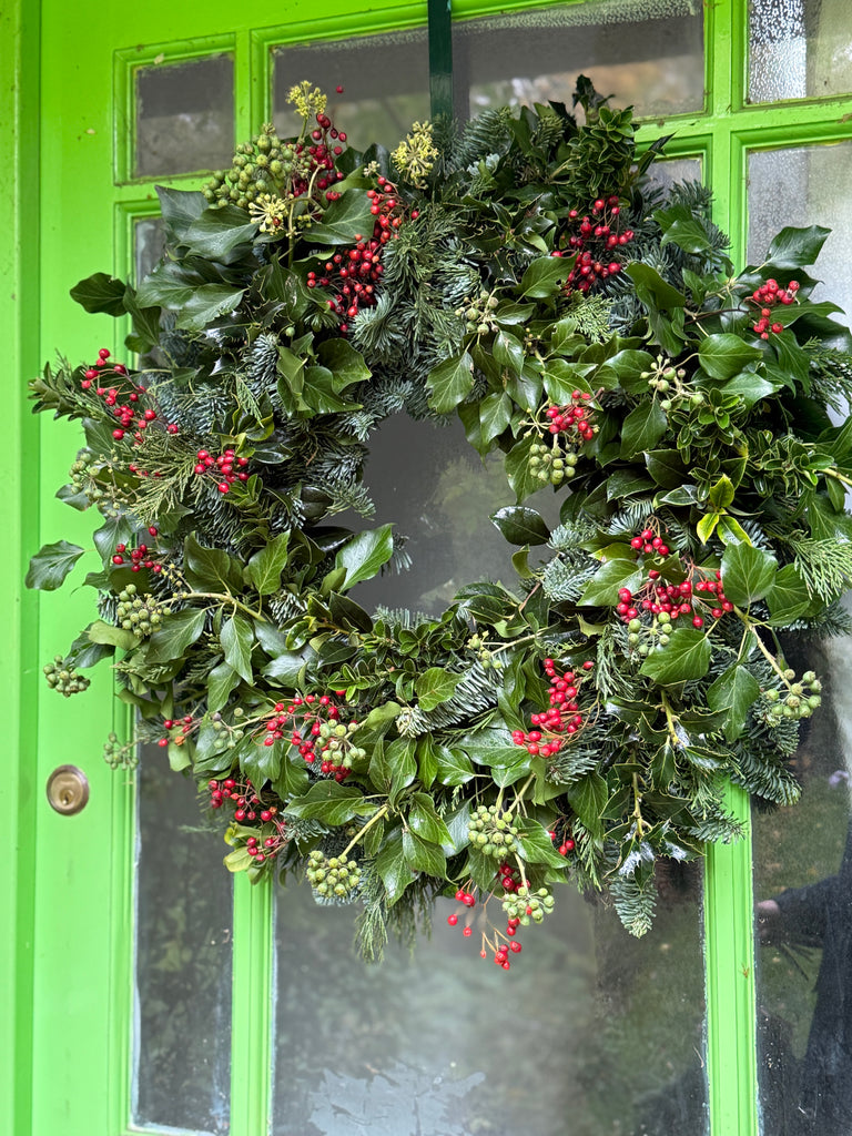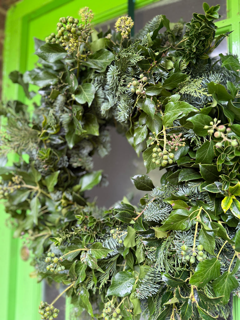 This luxurious evergreen Christmas wreath is richly adorned with seasonal foliage, offering a classic and natural holiday decoration. Enhance its charm with fresh red berries or enjoy it as a full, lush green display. For added ambiance, incorporate our battery-operated lights to keep it glowing both day and night. Part of our signature eco collection, this wreath features foliage sourced exclusively from our own estate, crafted with Welsh moss, and fully recyclable. With its naturally grown elements, expect unique variations and natural imperfections. For optimal freshness, order for early to mid-December delivery. Matching garlands are also available.