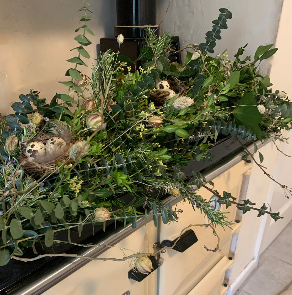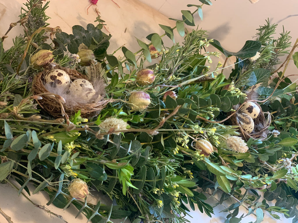 Hand bound using fresh foliage from our own estate, with dried flowers, grasses and Easter decorations. Team with our natural Easter wreath for your door.